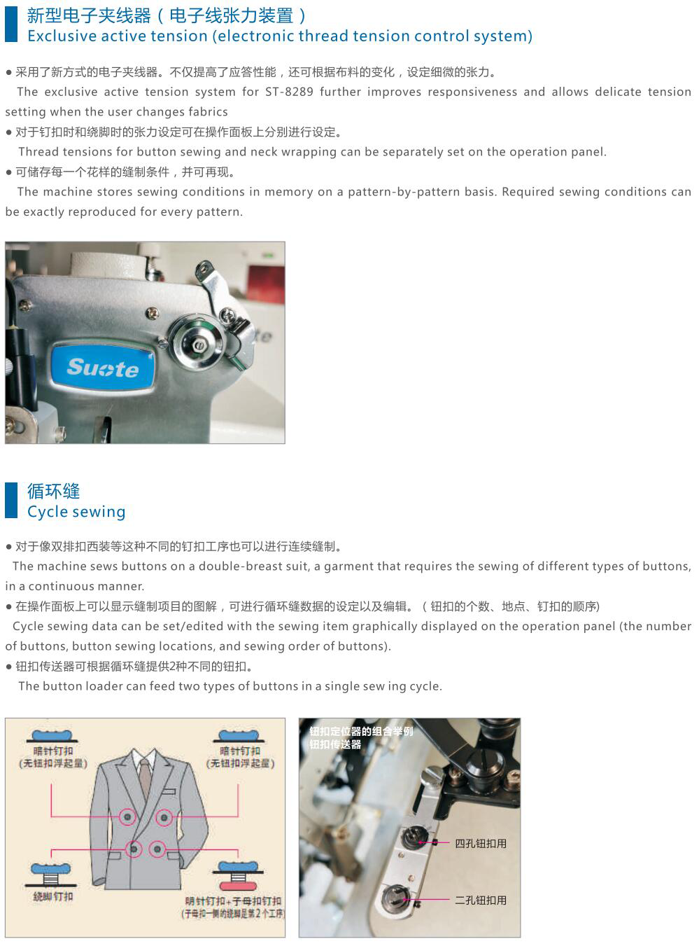 對于像雙排扣西裝等這種不同的釘扣工序也可以進行連續縫制。